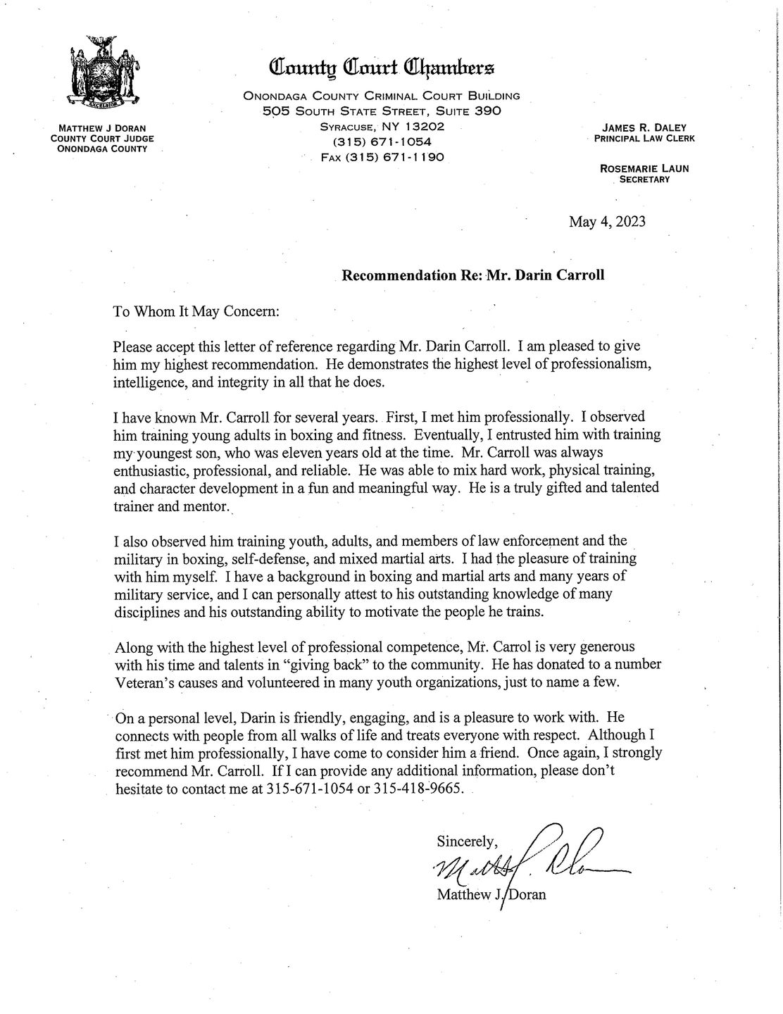 I have known Darin Carroll for over 25 years, in the recent years I have had the opportunity of working with Darin, hiring him as a Boxing Coach for some of my Cornell University Programs. Darin is a consummate professional. He has consistently brought an attitude of energy, respect and professionalism within his coaching style. His openness and constant strife for improvement, both personal and with his students, is unique and remarkable. Darin is always been there to help and lend a hand to someone in need. I give Darin my highest recommendation as a Boxing Coach and I feel he would be a huge asset to any program or organization that he works with.